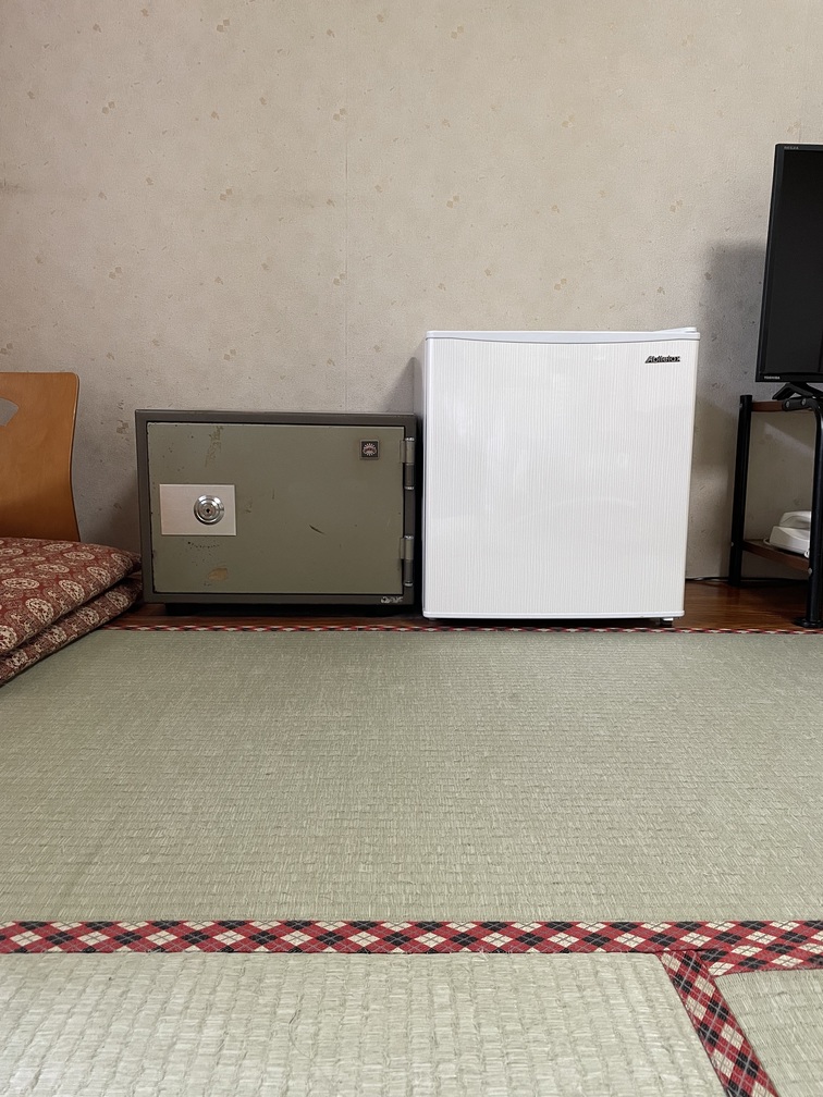 (右)金庫と冷蔵庫。冷蔵庫には冷えたグラスが5個入っていました。