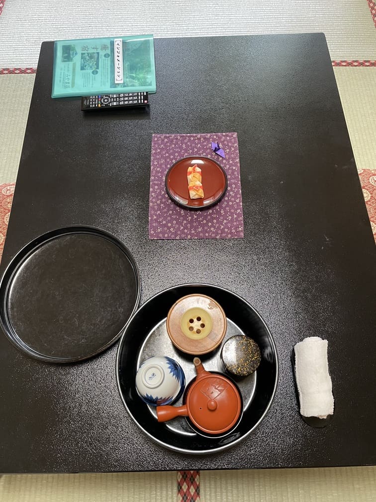 (左)テーブルには湯のみセットとお茶菓子。