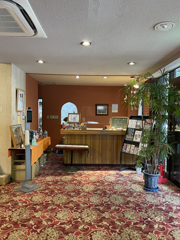 五峰荘さんに入り、右側のフロントで声をかけてください。階段で1階に降りると貸切風呂と大浴場へ行けます。
