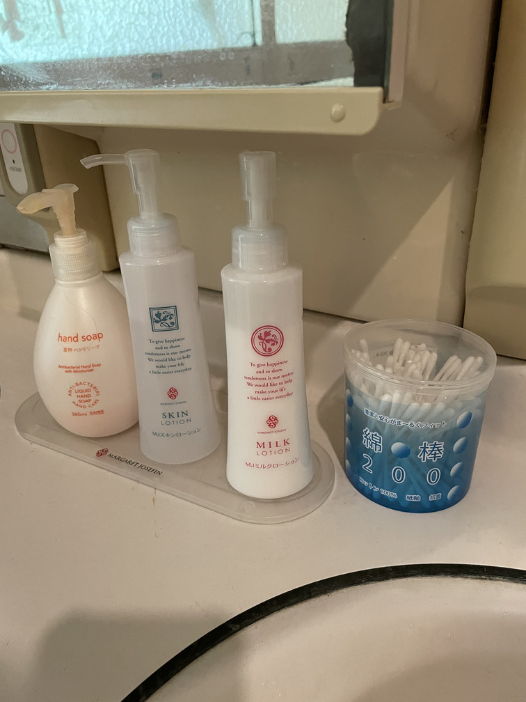 (左)スキンローション、ミルクローション、ハンドソープ、綿棒はありました。