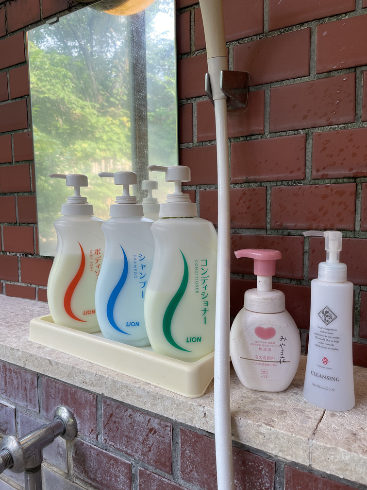 洗い場には、シャンプー、コンディショナー、ボディーソープなど一通り揃っています。桶と椅子は壁側に置いてあります。