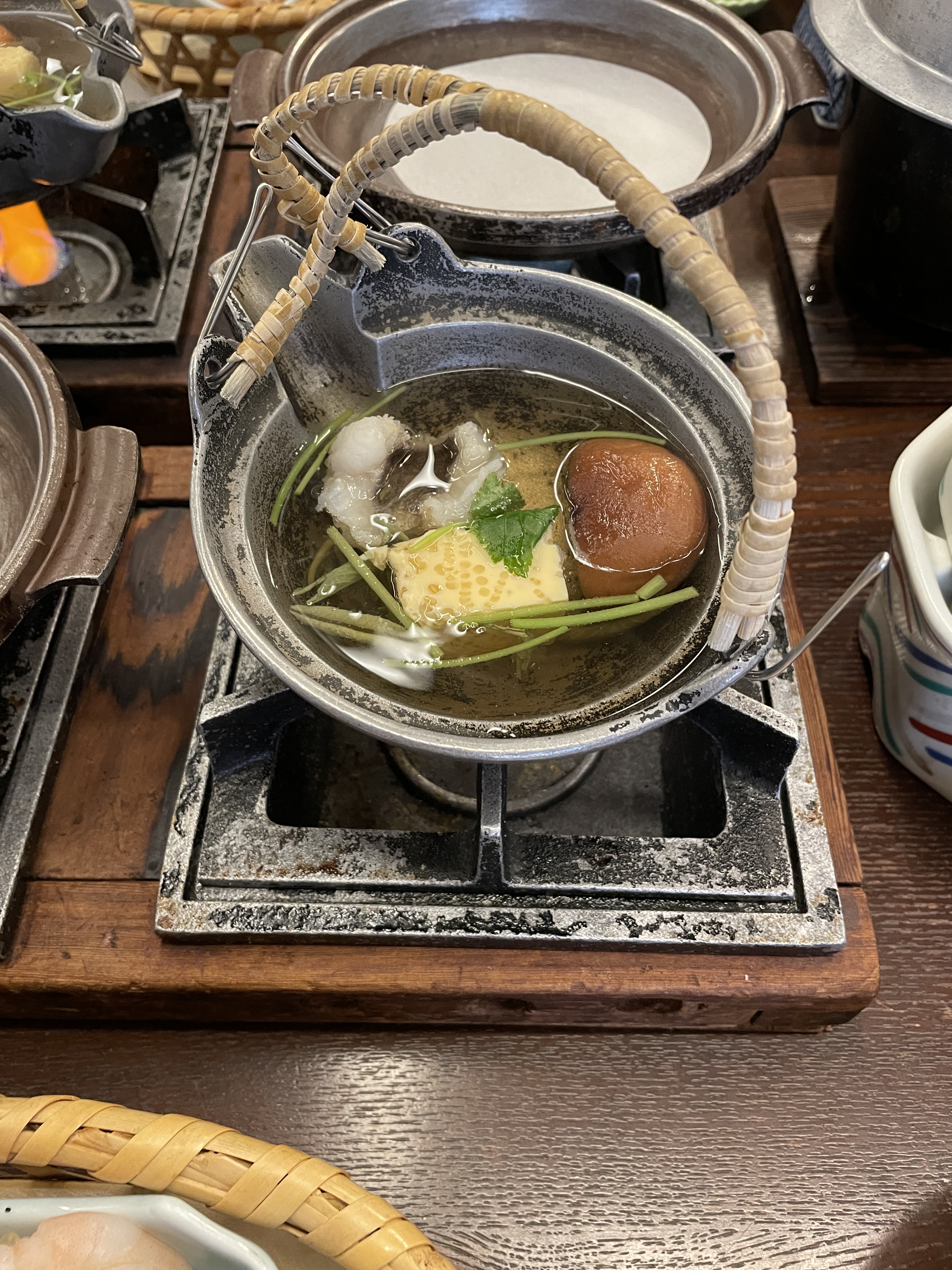(右)椀替り 鯖と尊菜の土瓶蒸し 椎茸・三つ葉・玉子豆腐