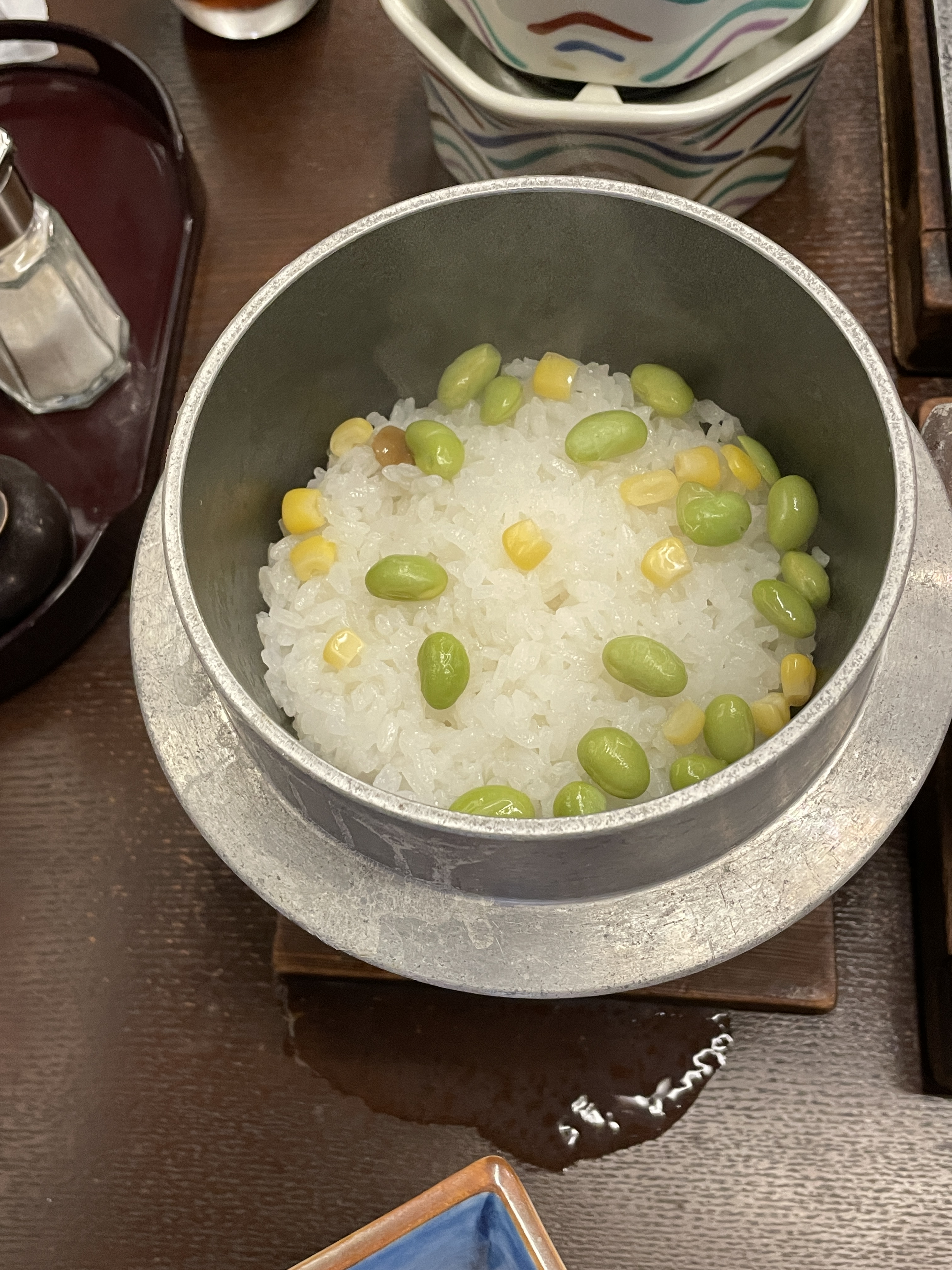 (右)食事 もろこしご飯(群馬県産コシヒカリ使用)・香の物