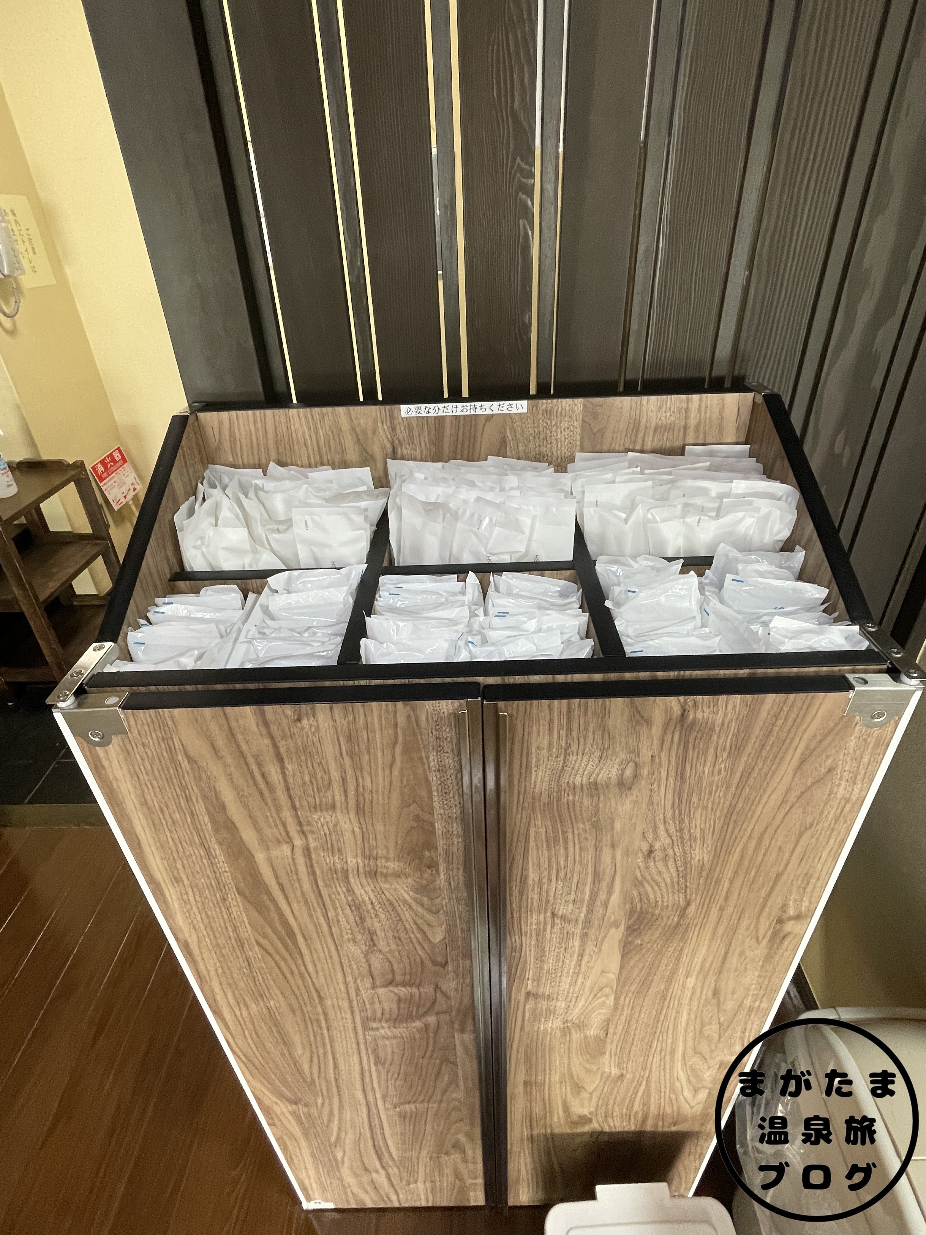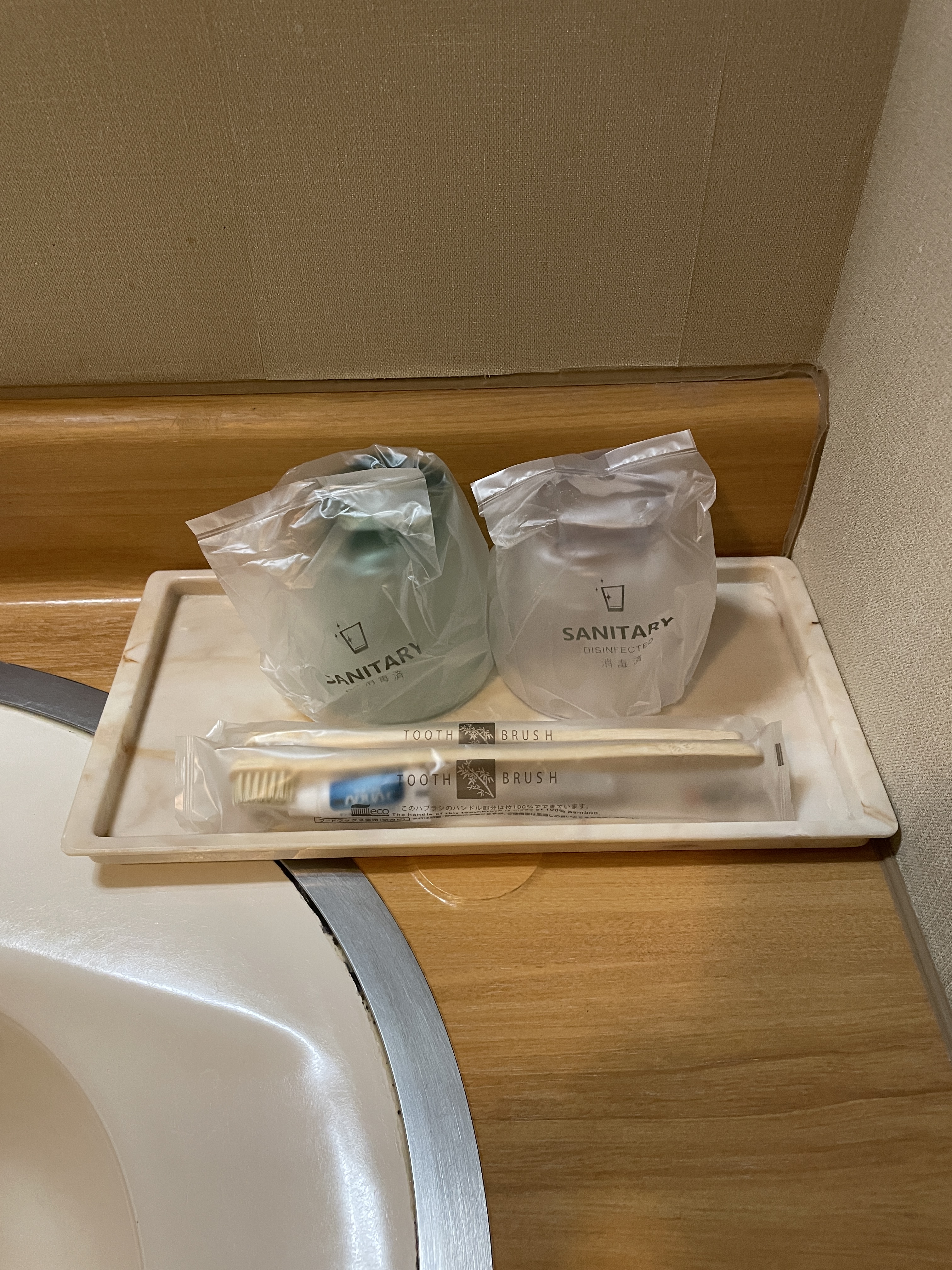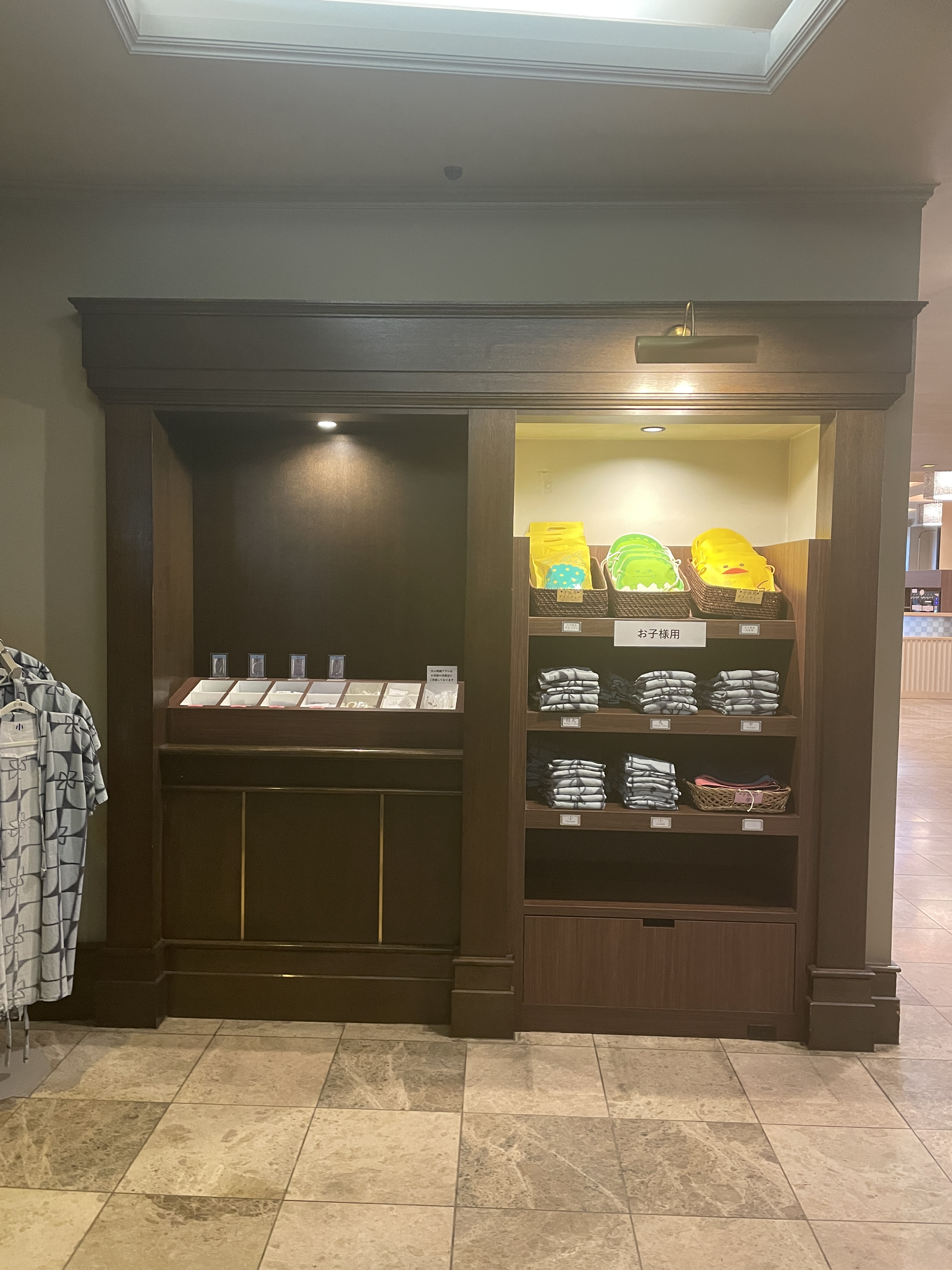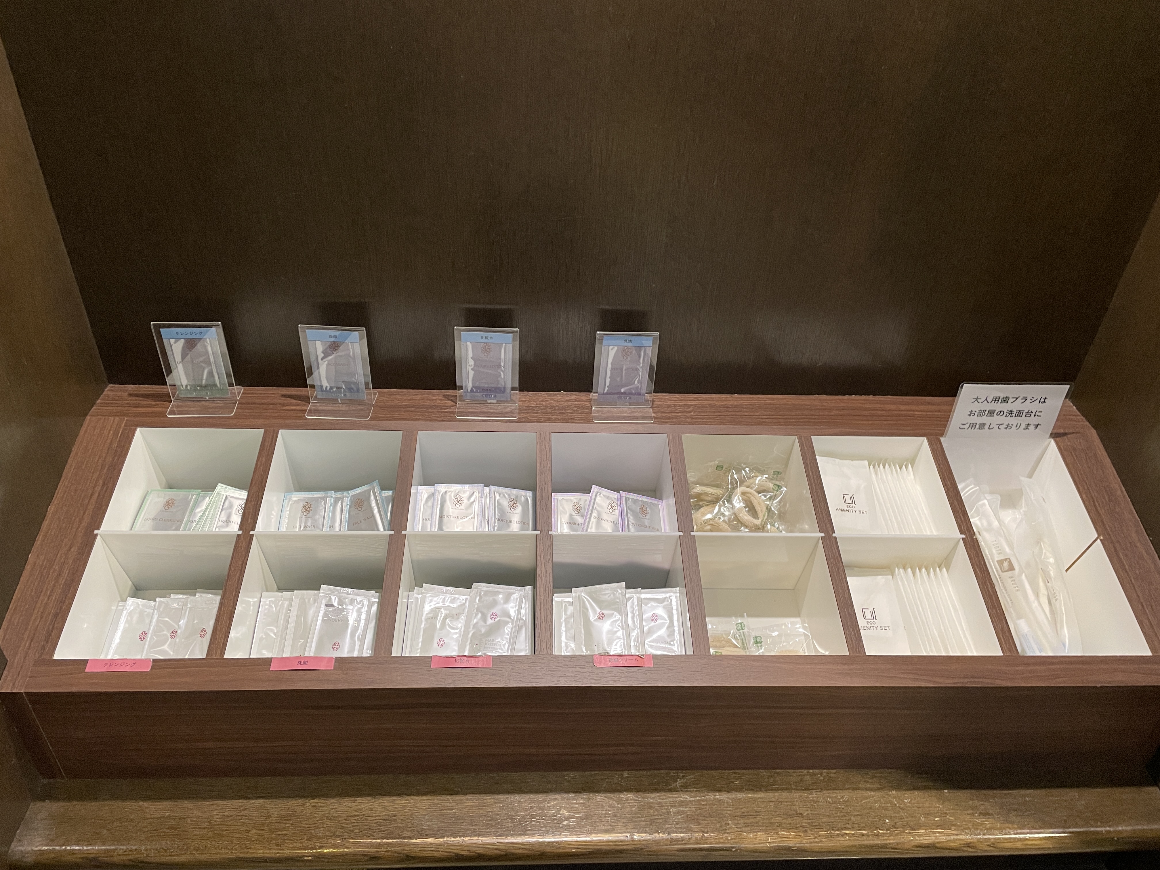 お部屋にアメニティが置いてありませんので、ロビー階でいただいてお部屋へ持ち帰りましょう。大人用の歯ブラシはお部屋にありますよ。
