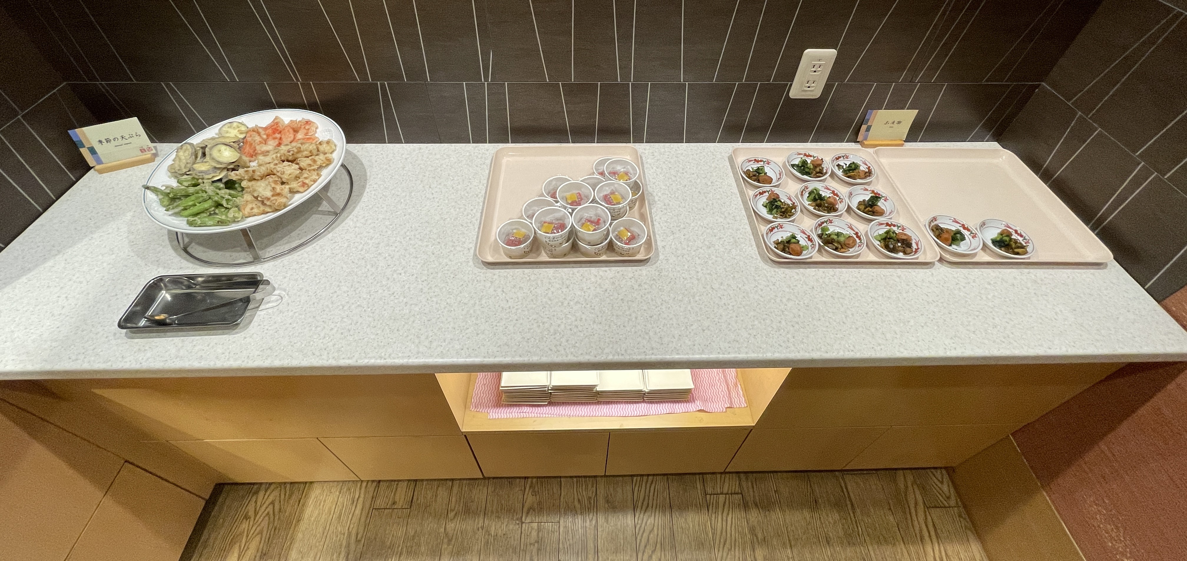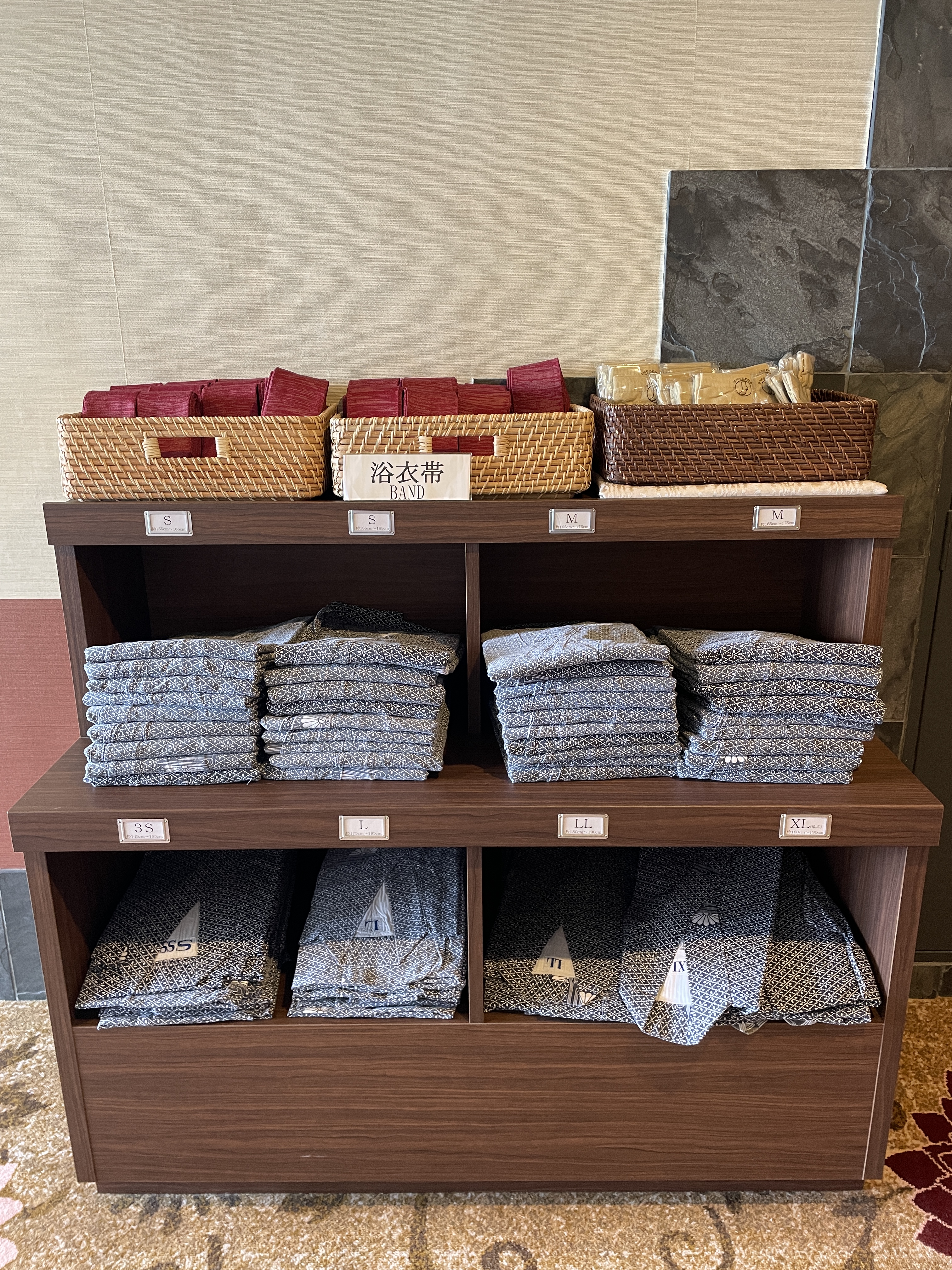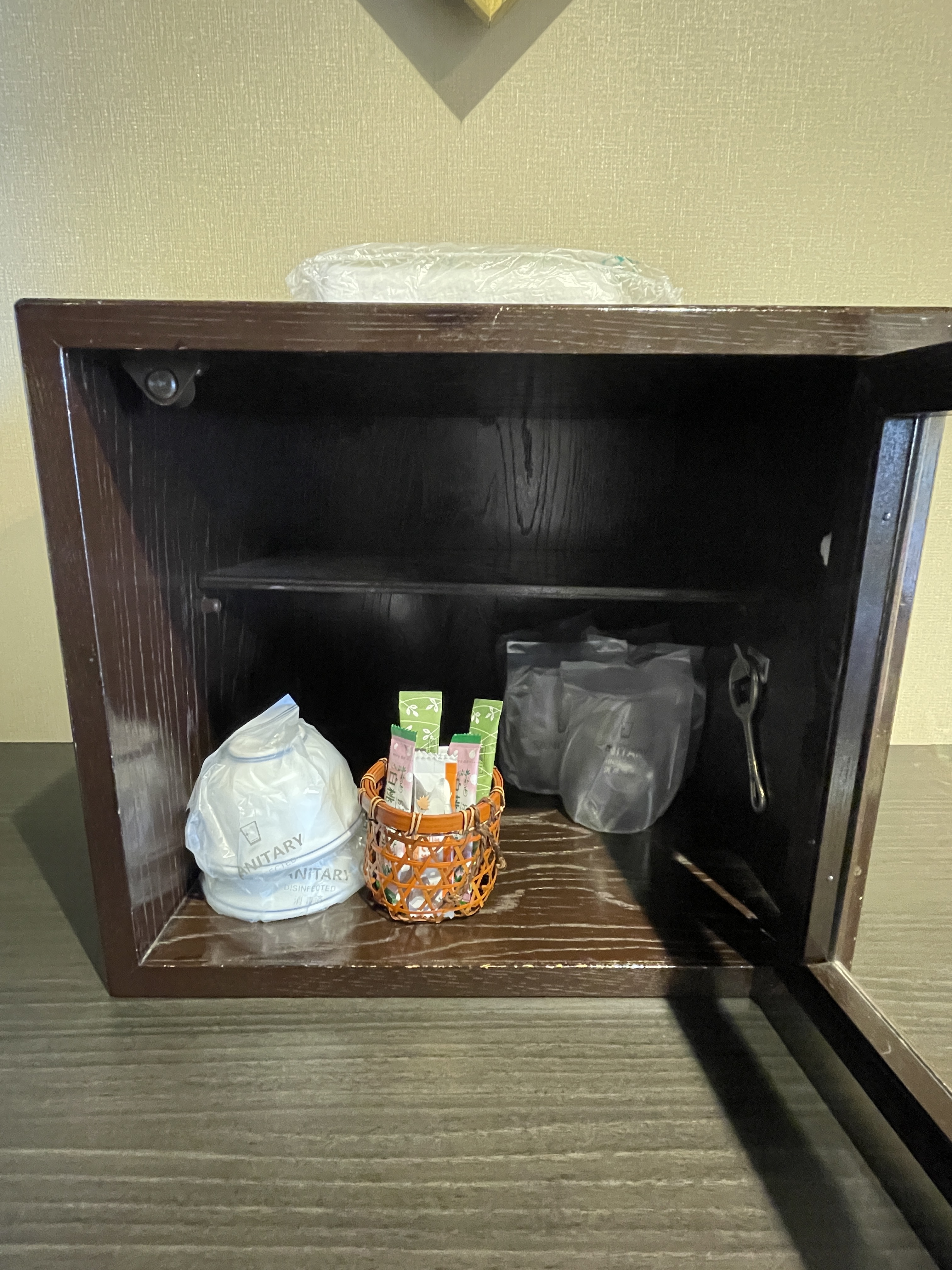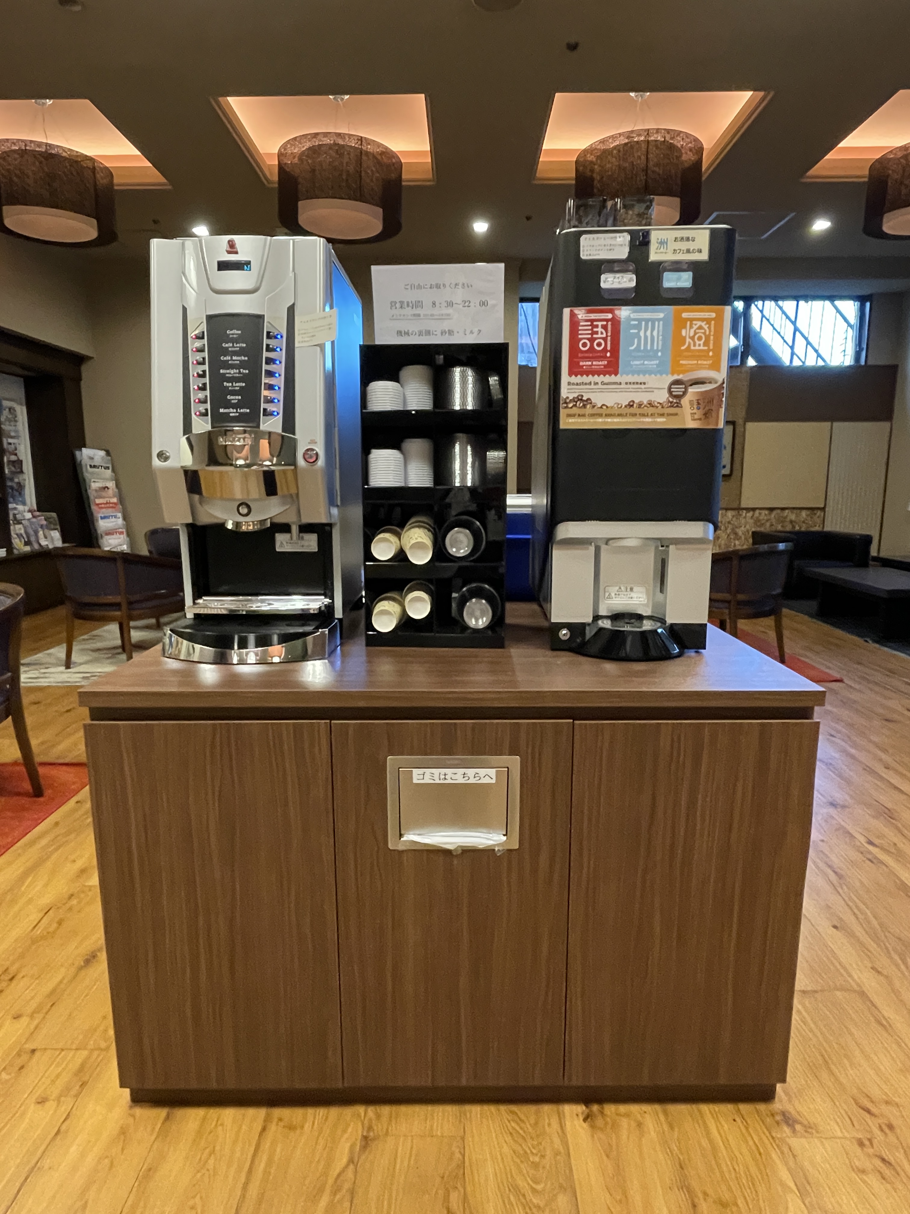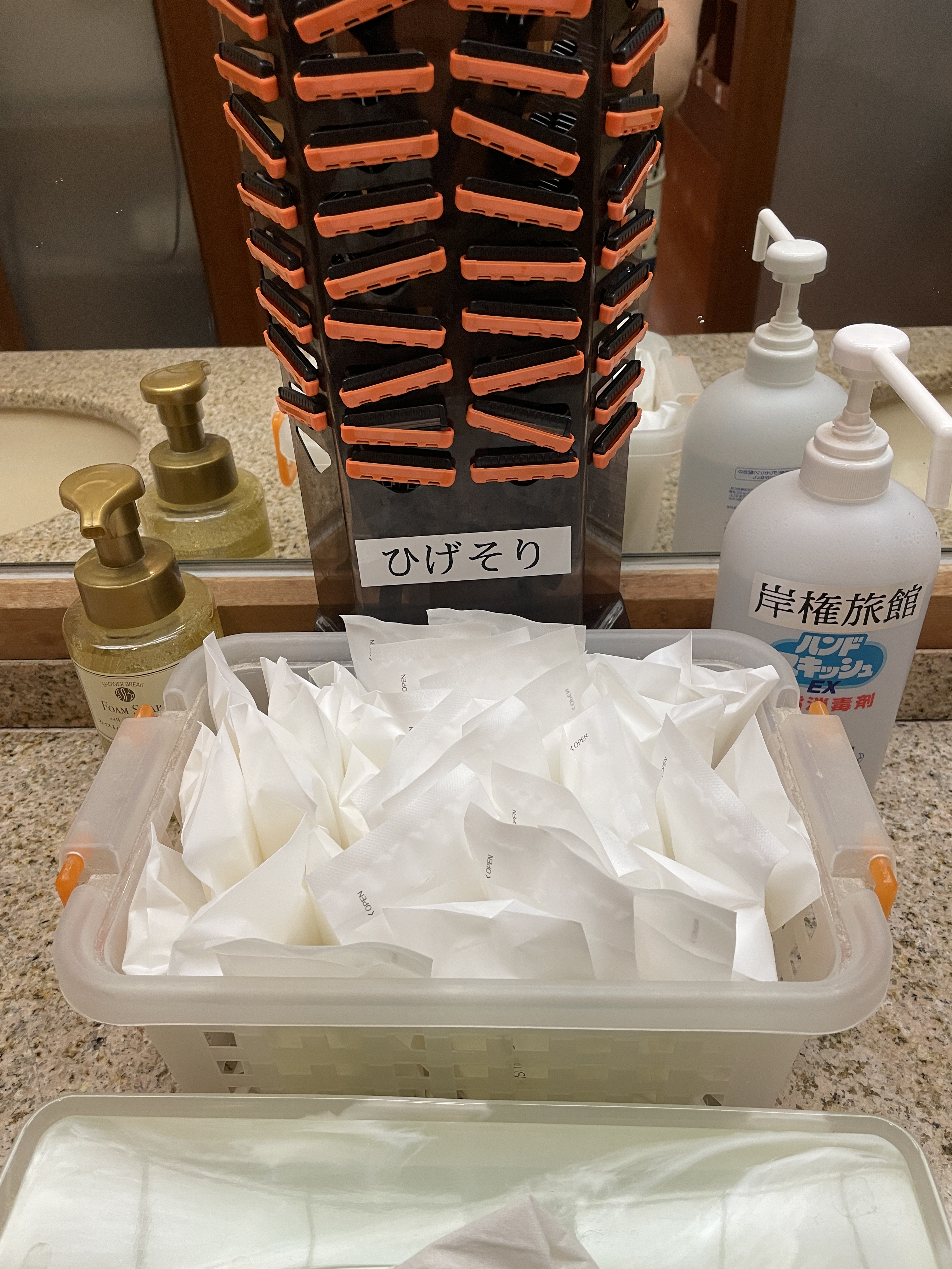 お部屋にアメニティが置いてありませんので、ロビー階でいただいてお部屋へ持ち帰りましょう。大人用の歯ブラシはお部屋にありますよ。