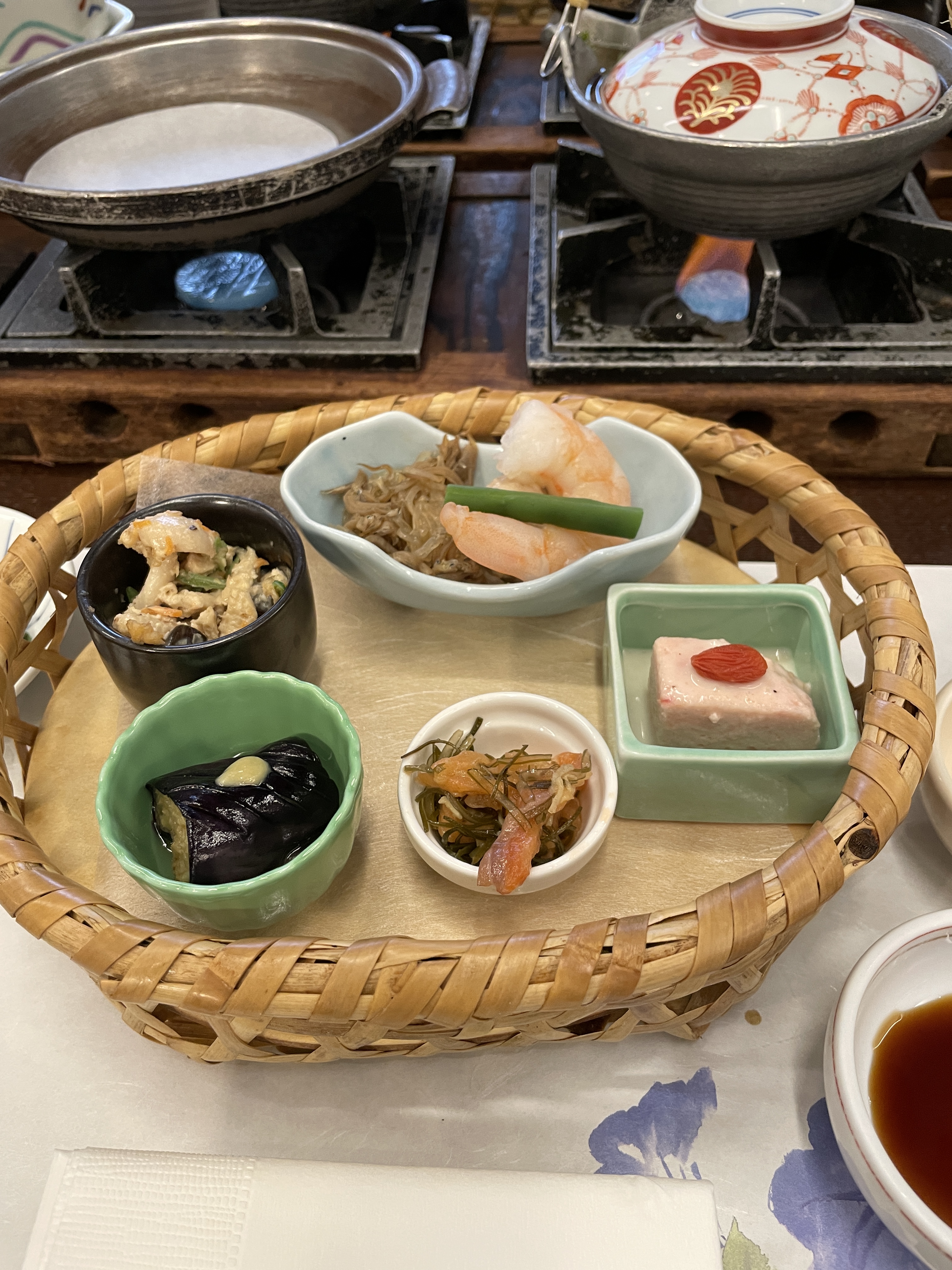 (左)先八寸 トマトのムース、茄子の玉味噌掛、糸蒟蒻とじゃこ金平、隠元豆の胡麻和え、ギンヒカリの昆布〆、赤城鶏のつくねと海老