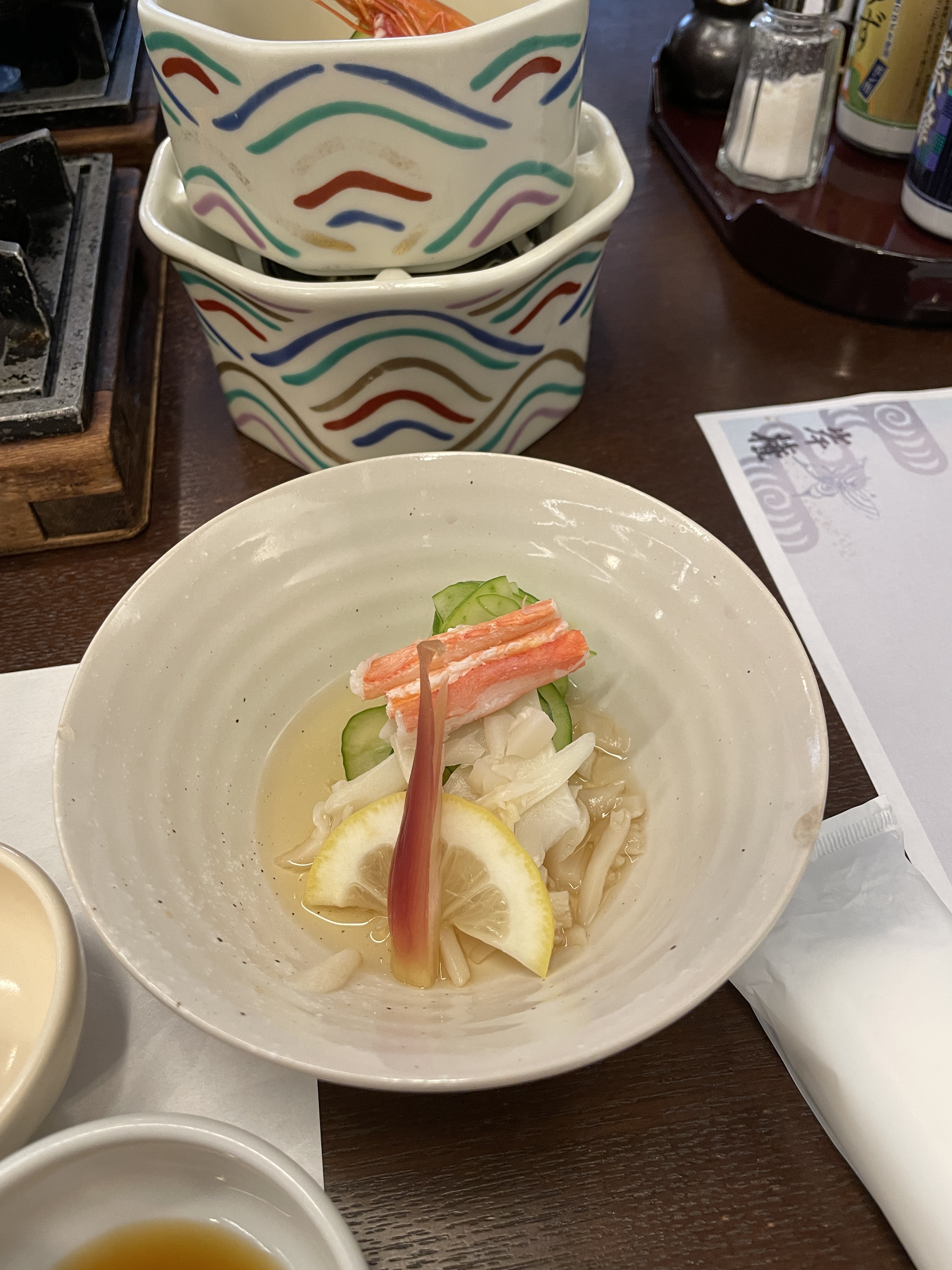 (右)箸休め 白瓜と蟹身の酢の物、茗姜・白舞茸