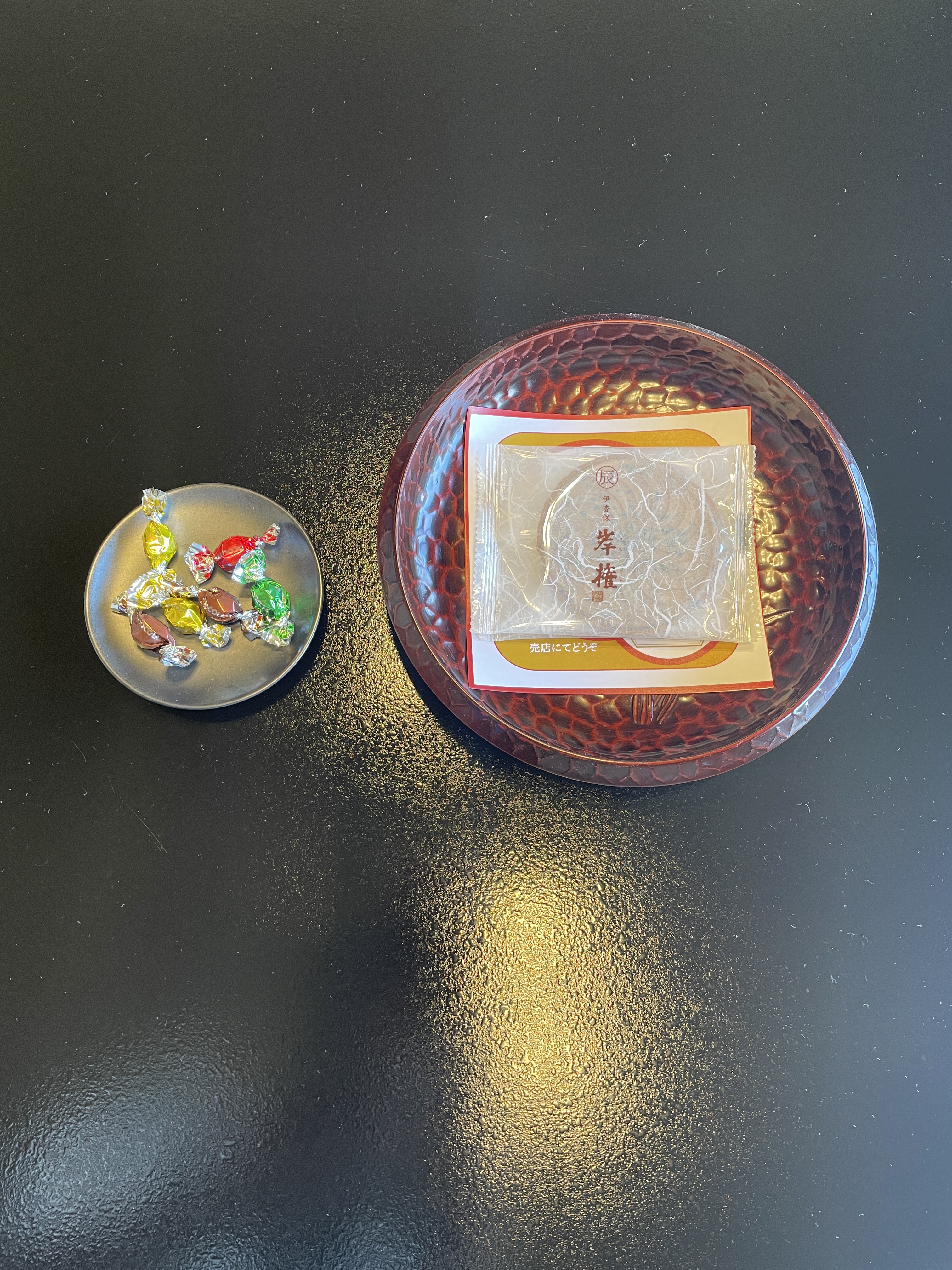 お茶菓子は、チョコレートと岸権のお菓子です。美味しくいただきました。
