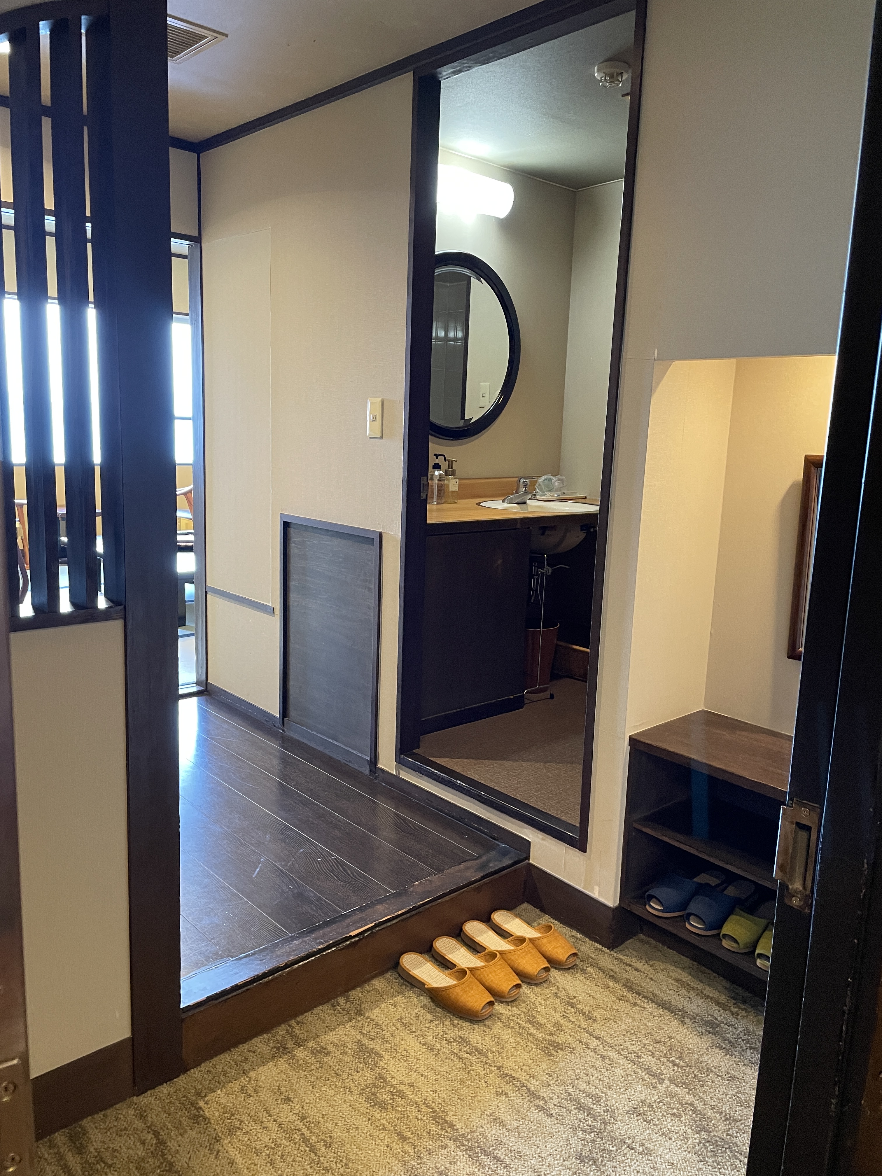 ドアを開けると、入り口にはスリッパ、右奥には洗面所があります。