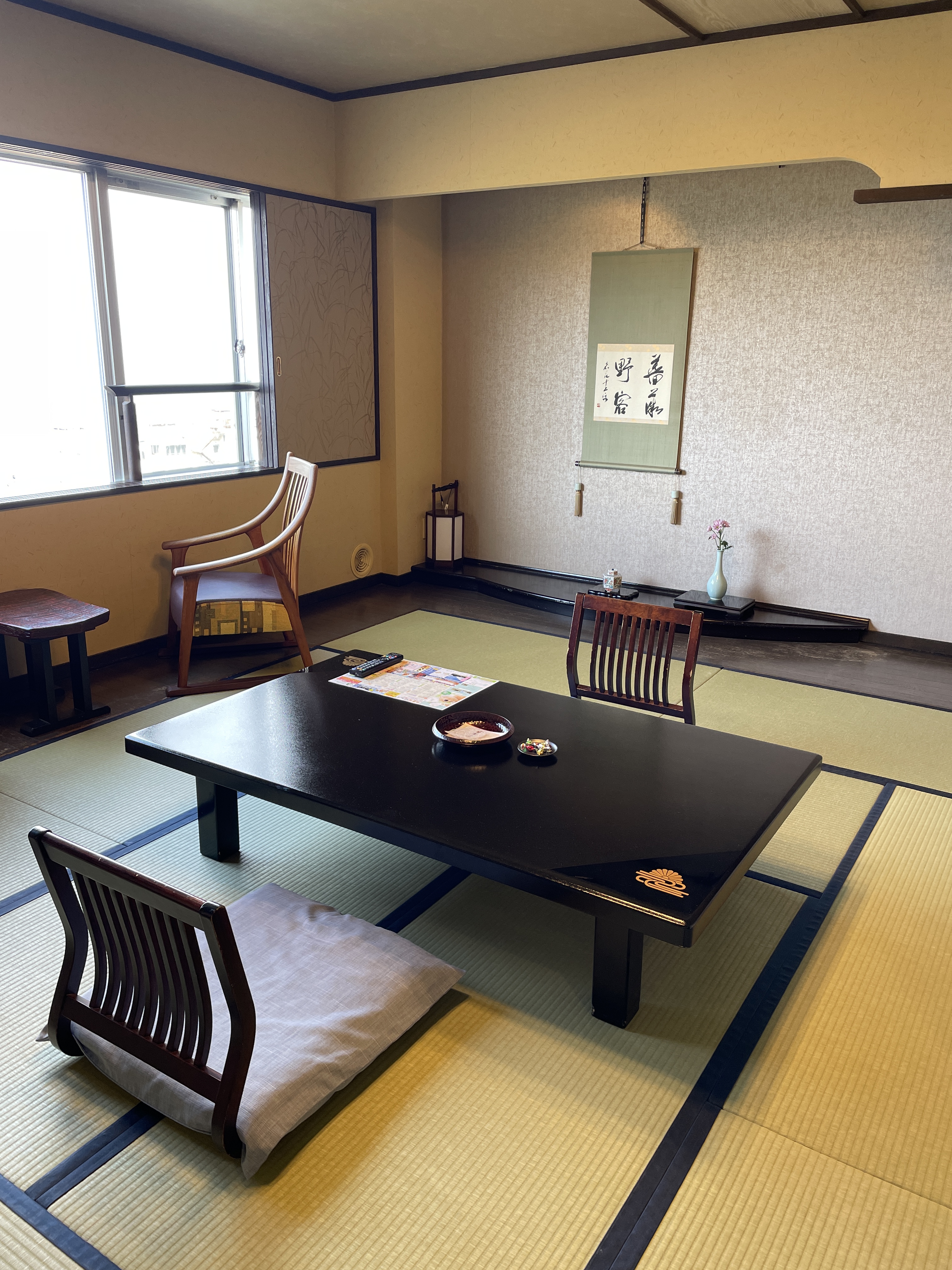 駐車場から送迎車で岸権旅館さんまで送っていただくと、旅館のスタッフさんがお出迎えをしてくださり、荷物をカートで運んでくださいました。
