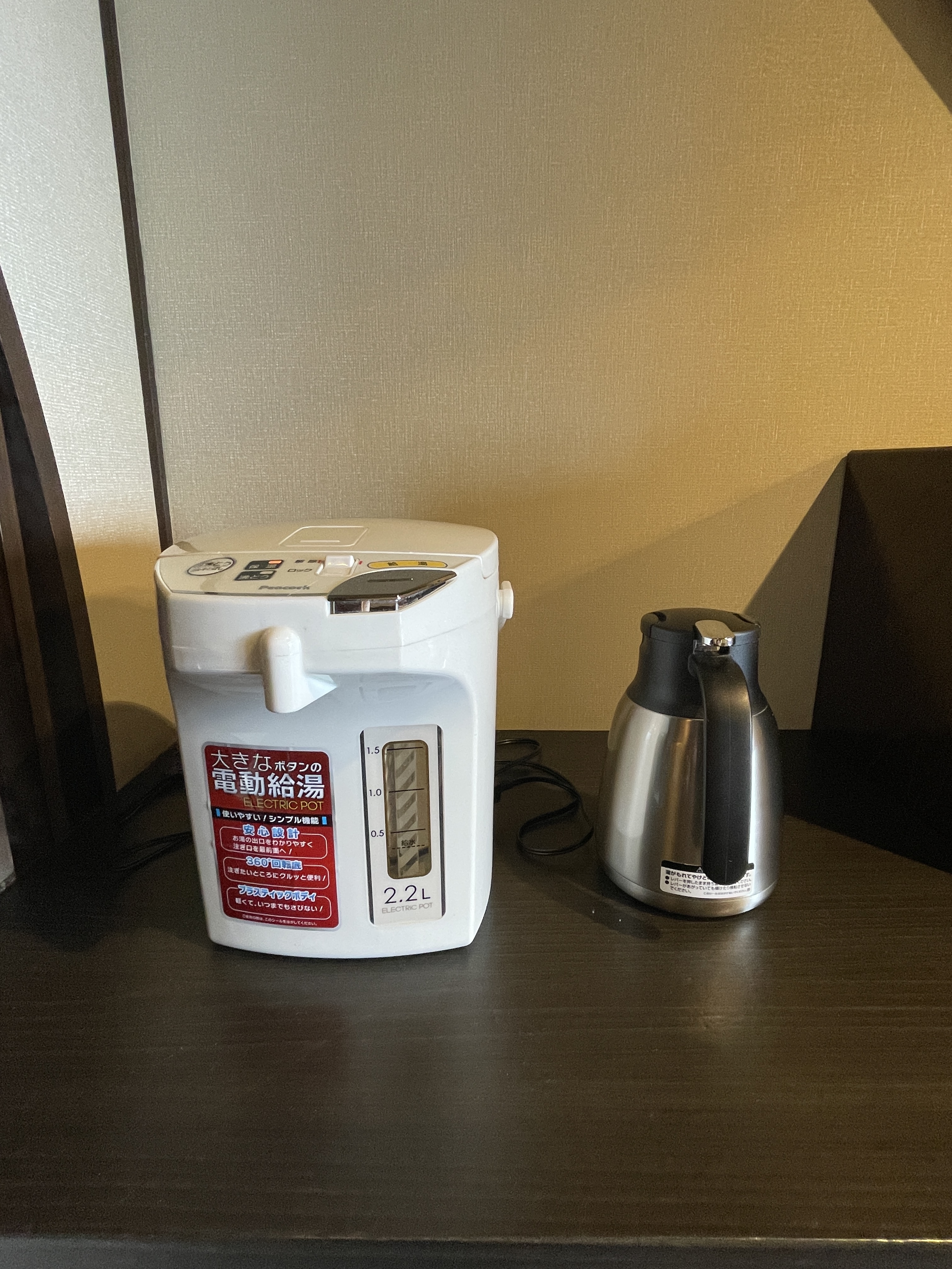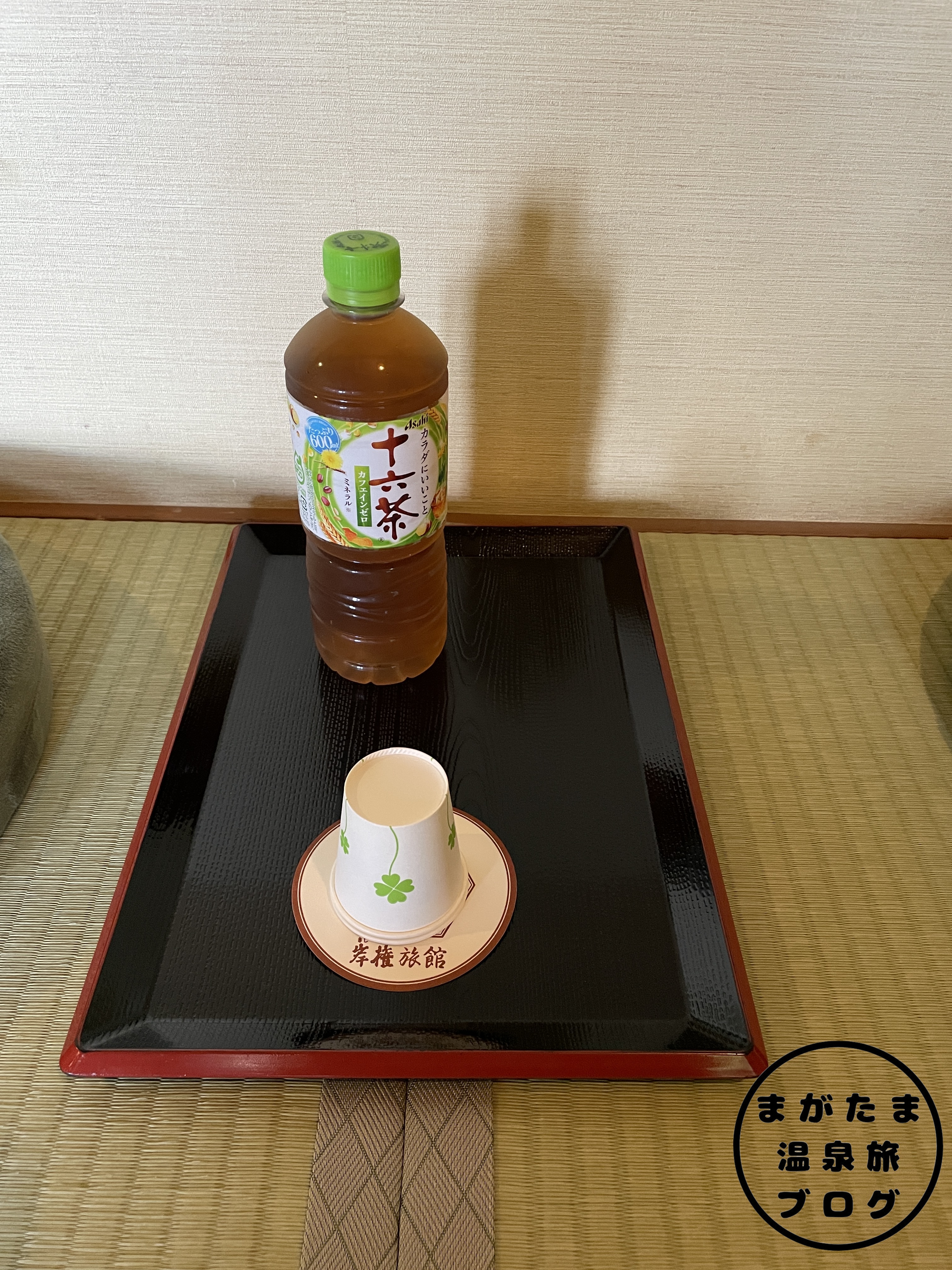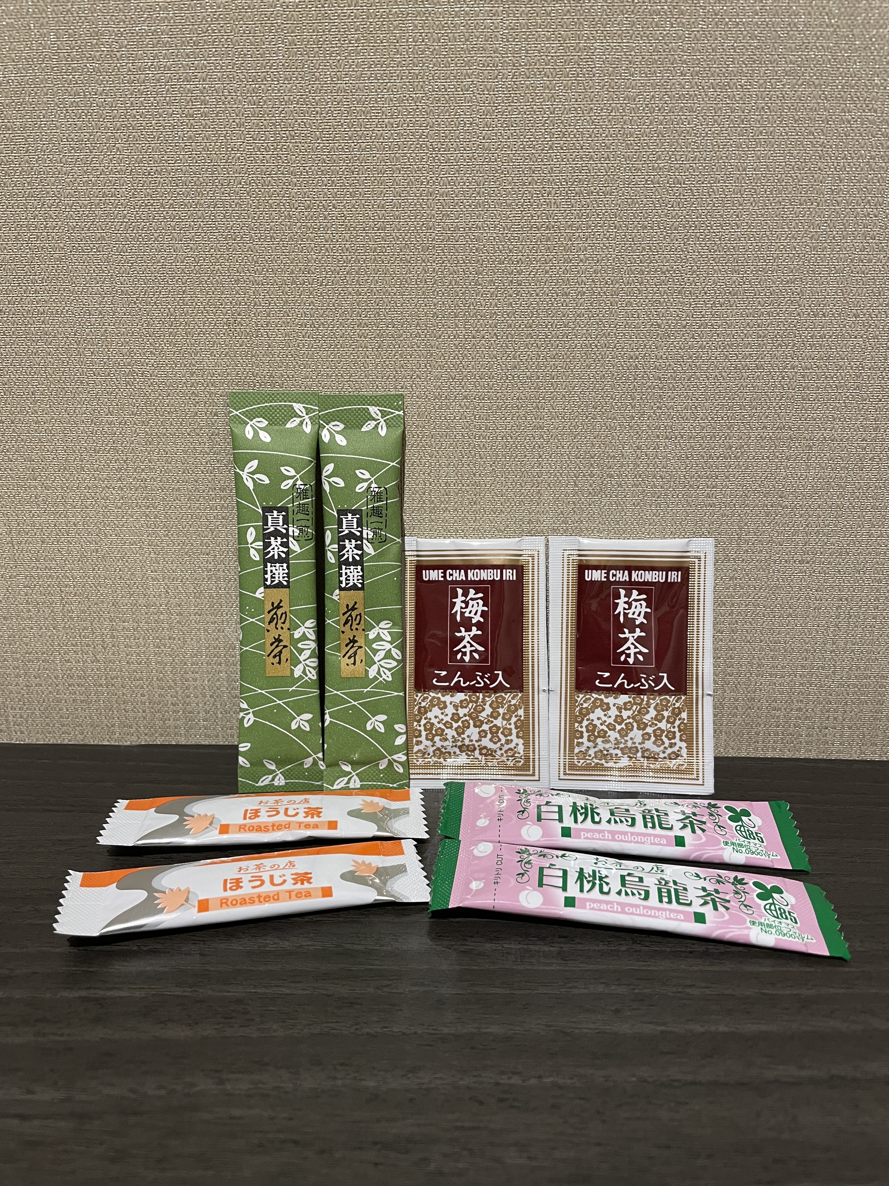 湯のみとコップ、ほうじ茶や烏龍茶など種類豊富のお茶の用意がありました!