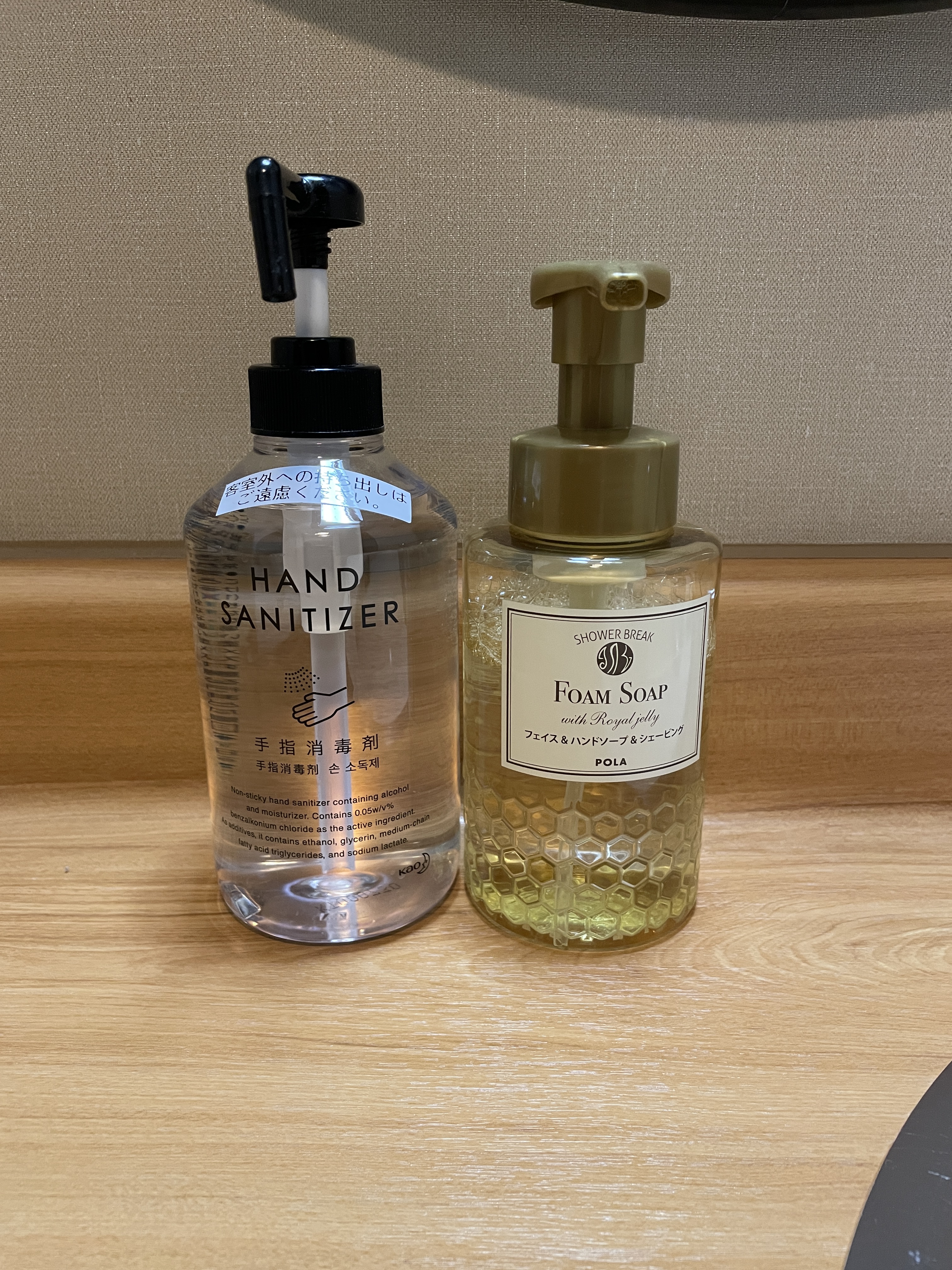 手指消毒剤とフェイス&ハンドソープ&シェービングのフォームソープ。歯ブラシとコップ。