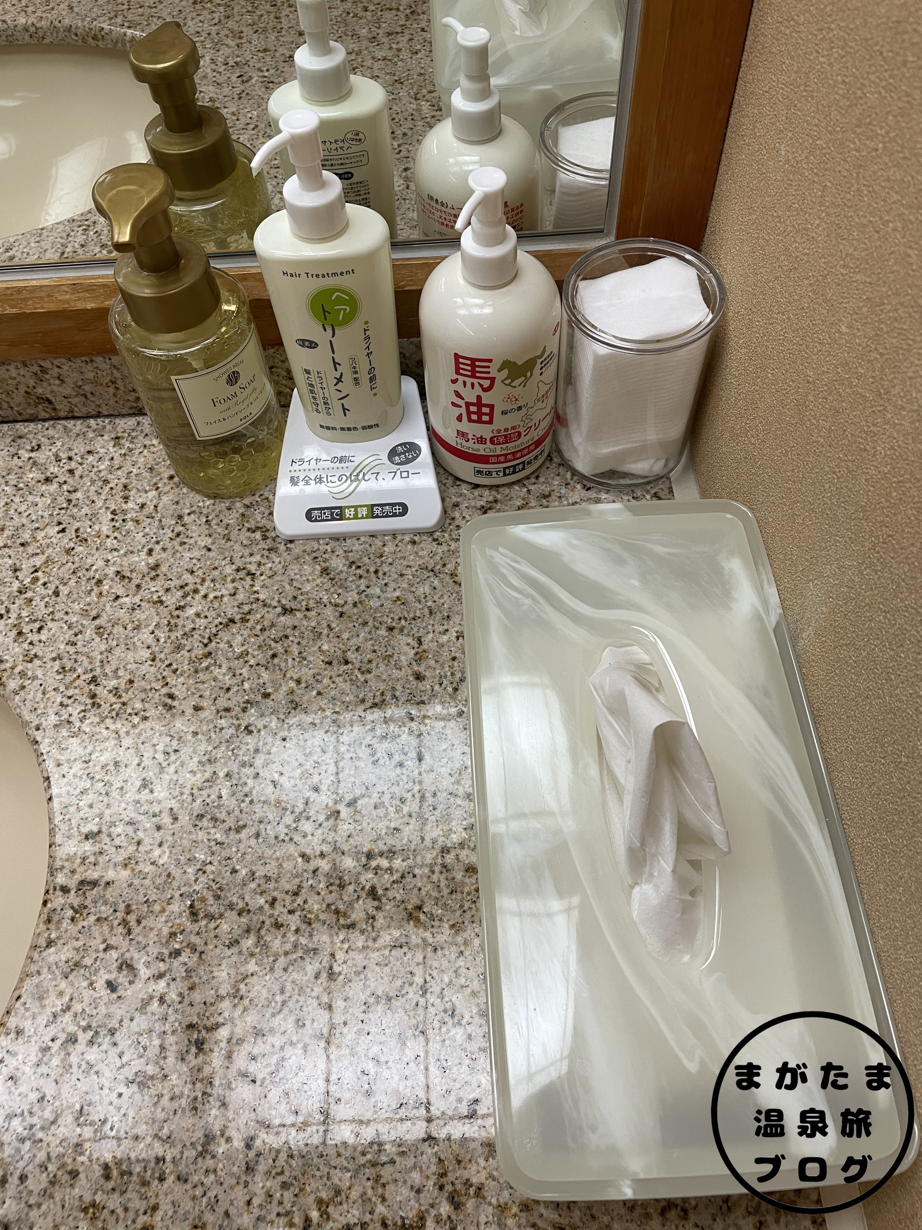 クレンジング、洗顔、化粧水、乳液、ヘアゴムなどが置いてあります。