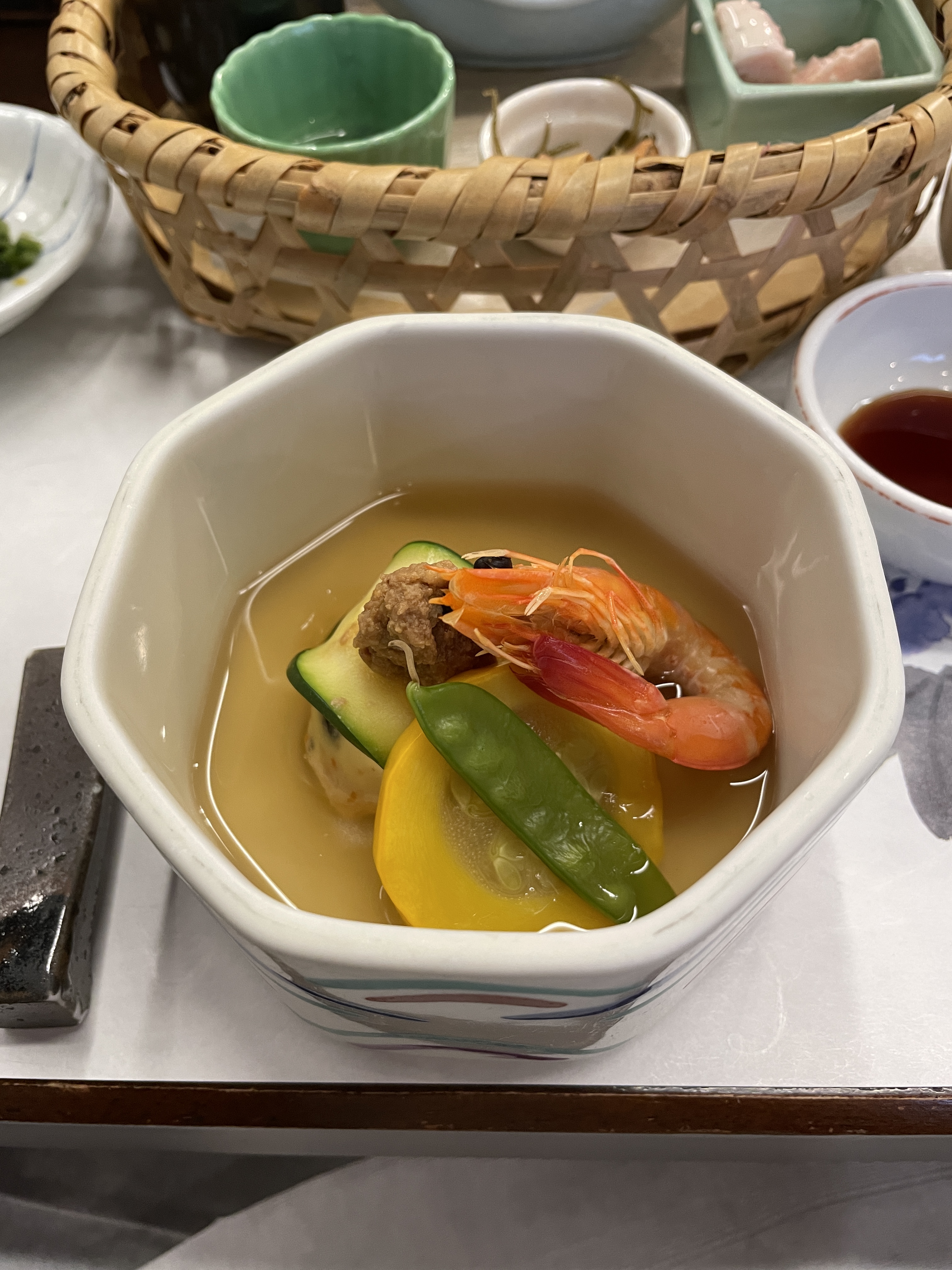 (左)温鉢 冬瓜けんちん蒸し、絹さや・ズッキーニ・鶏みそ