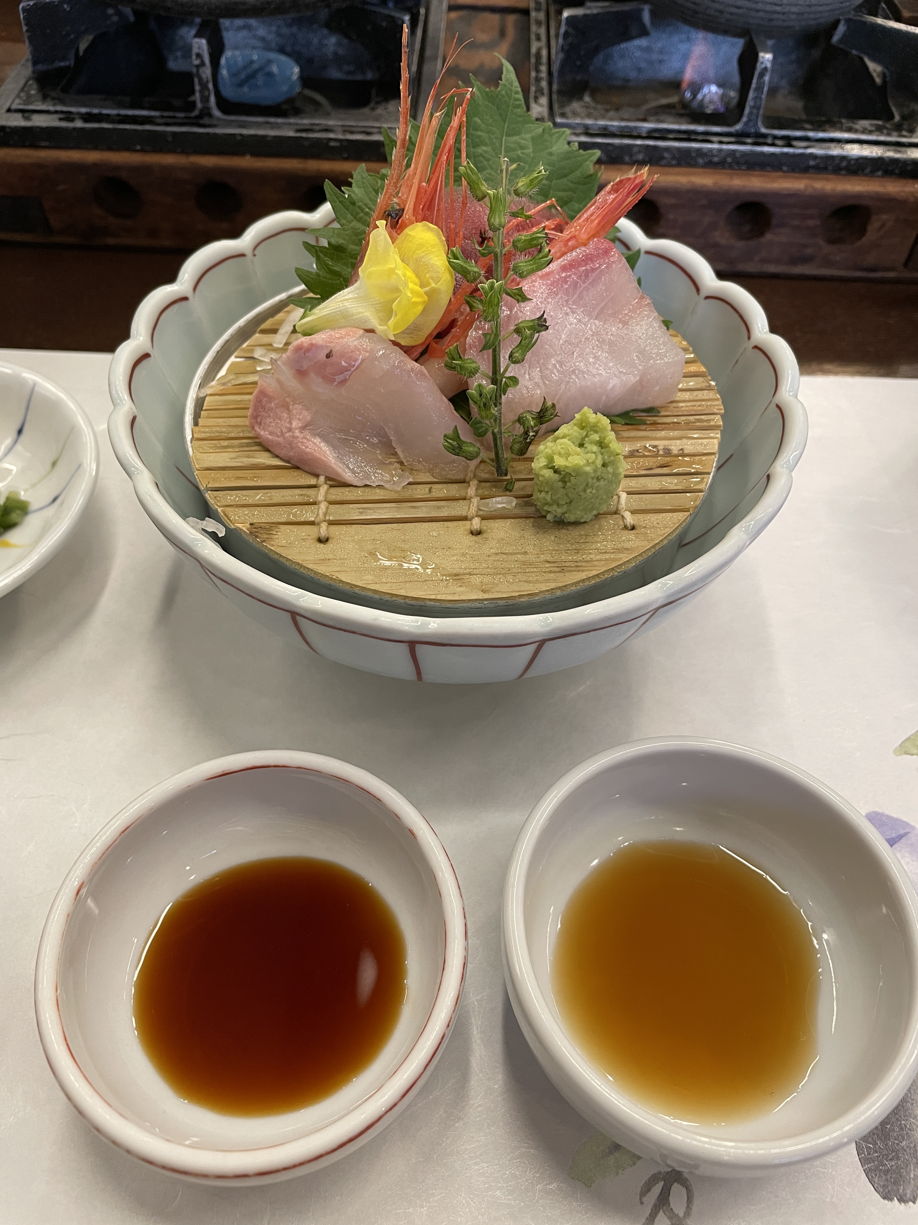 (左)造里 旬の鮮魚と甘海老、妻いろいろ・山葵
