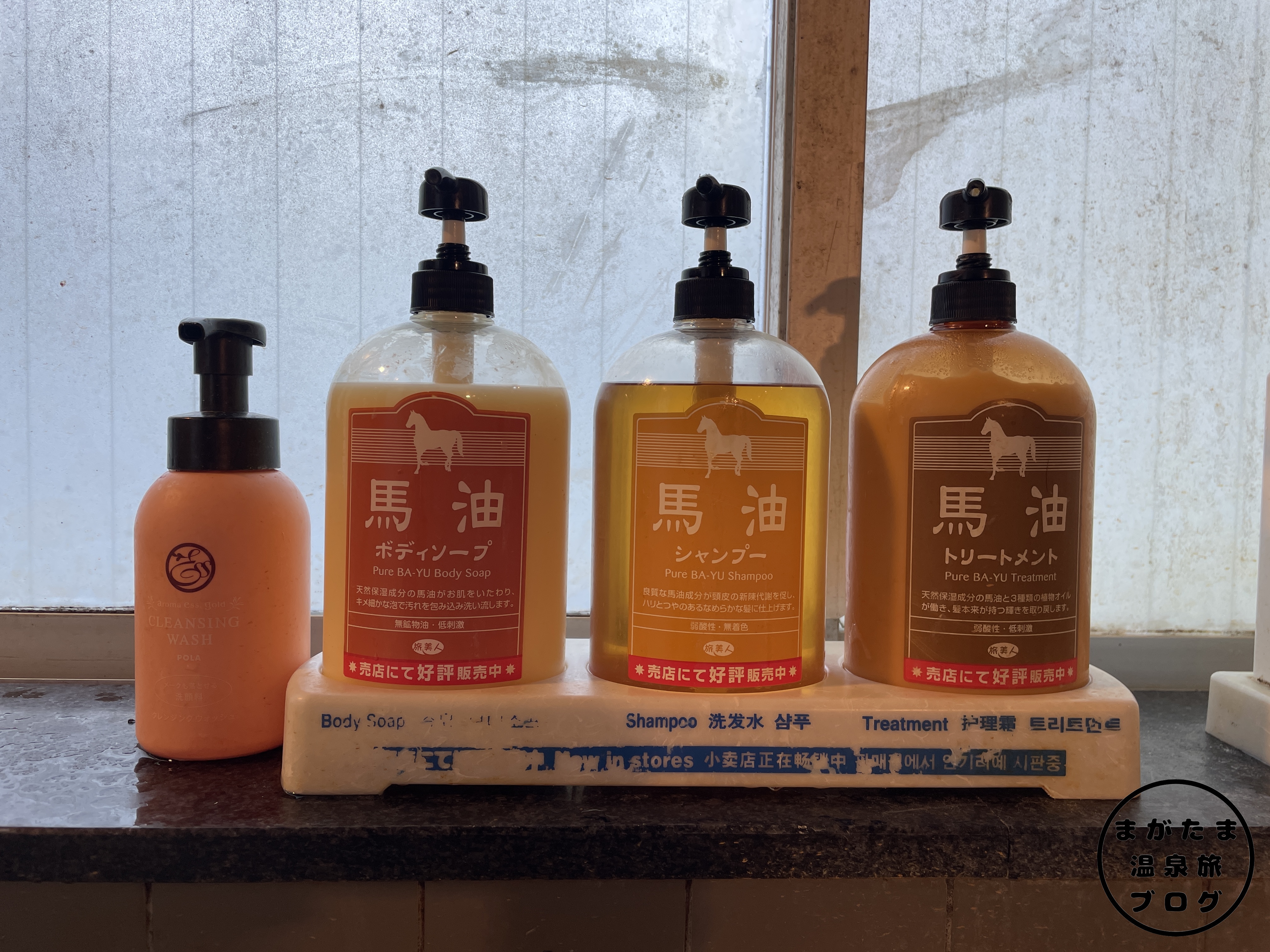 (左)ボディソープ、シャンプー、コンディショナーと一通りあり。