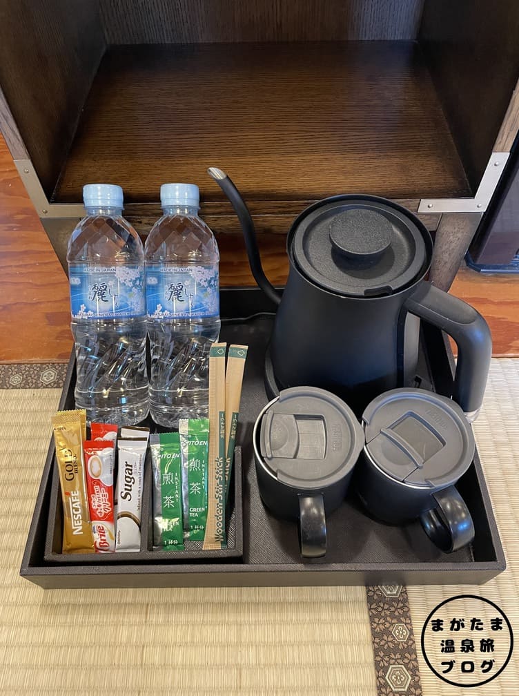 (右)棚の下には、電気ケトル、タンブラー、水、お茶、コーヒーなどの用意があります。