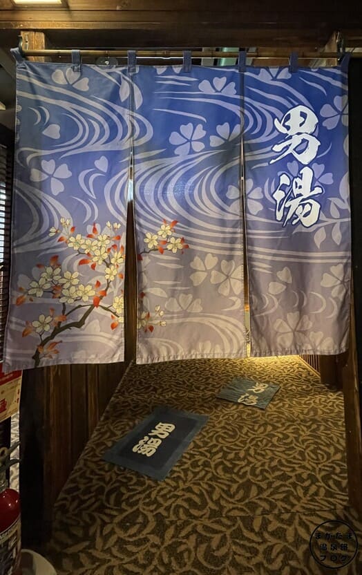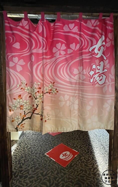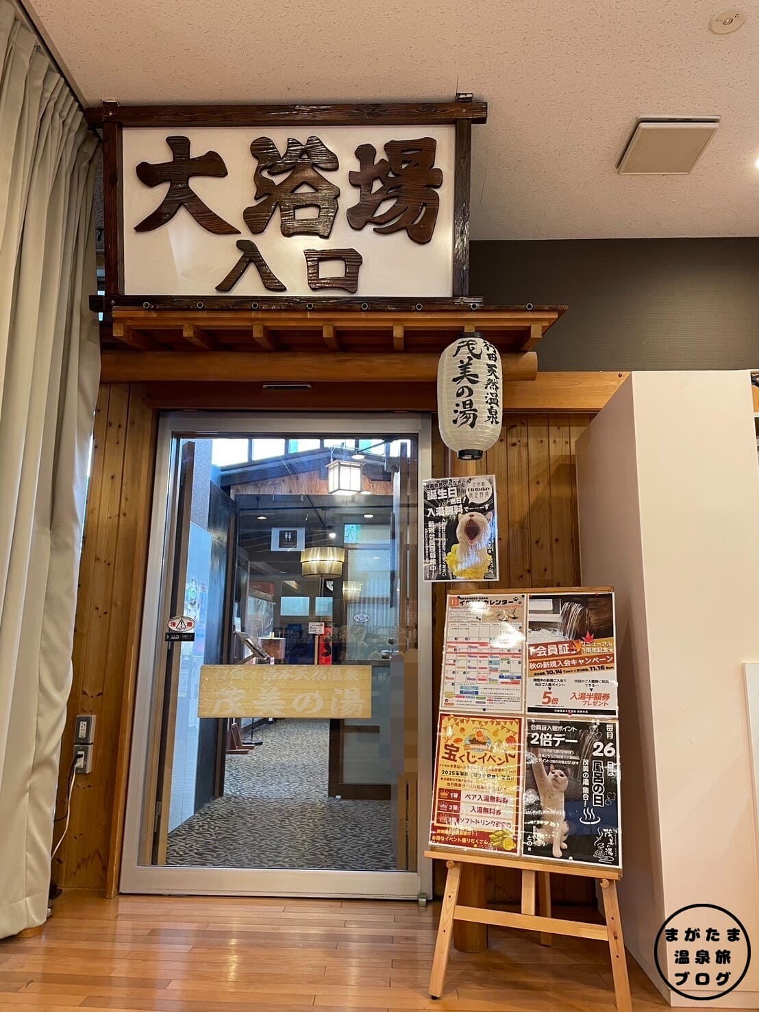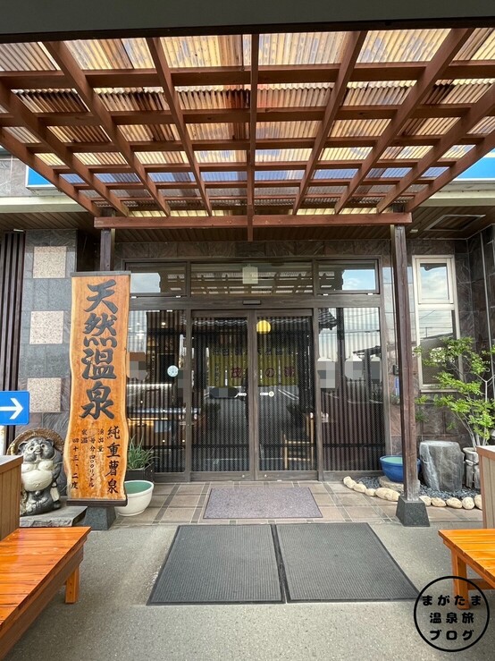 (右)のれんをくぐりますと、天然温泉純重曹泉と書かれている木の看板が掲げられています。自動ドアから入りましょう。